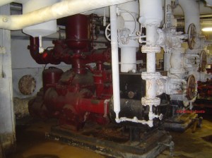 This is a Steam Underwriters Pump. They were the mainstay of fire protection pumps at the turn of the last century. Today, these pumps are not longer recognized for fire service. Today, plants do not typically maintain a reliable head of steam to operate these pumps. Click for more on fire pumps.